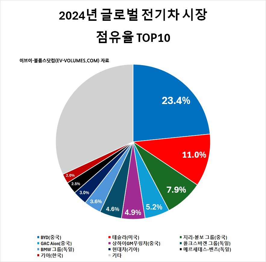 글로벌 시장조사기관 이브이-볼륨스닷컴(EV-Volumes.com)에 따르면 작년 글로벌 레프리 토토사이트 시장에서 점유율 1위 자리는 23.4%(약 427만대)의 BYD가 차지했습니다. 점유율 11.0%(약 179만대)인 2위 테슬라와 격차를 2.4배 벌인 수치죠. 레프리 토토사이트 집계량엔 순수레프리 토토사이트(BEV)와 플러그인하이브리드레프리 토토사이트(PHEV)가 모두 포함됐습니다.