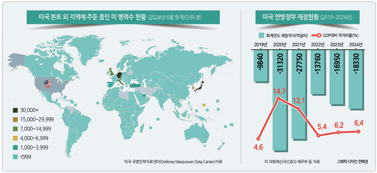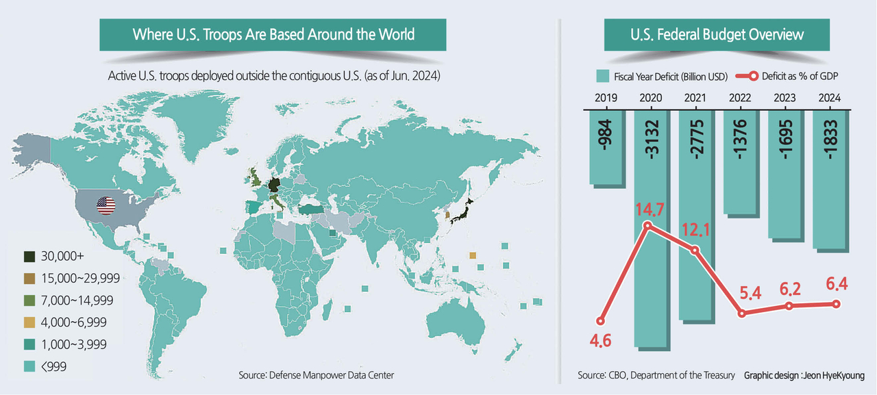 미국은 세계 곳곳의 안보를 책임지겠다고 나서며 사실상 ‘과다 팽창(overstretched)’ 국가가 돼 버렸다. 현재 약 80개국에 걸쳐 750여 개의 해외 군사기지를 운영 중이다. 국방부 예산은 물론, 핵무기 관련 지출, 정보기관 운영비, 국토안보부 예산, 해외 주둔군 지원, 재향군인 수당, 그리고 국방비 지출로 인한 부채 이자비용까지 합한 미국의 국가안보 관련 총 예산은 1조5000억달러에 달한다. 이는 미국 전체 재정적자의 약 75%에 해당하는 막대한 규모다.