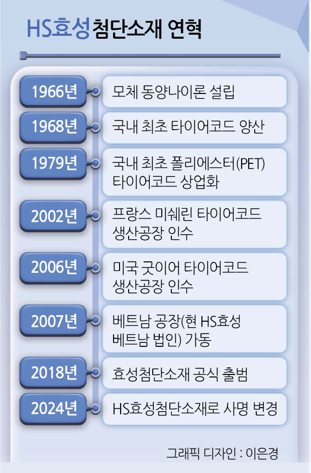 HS효성첨단소재는 올해 7월 출범 1주년을 맞는 HS효성의 핵심 계열사이다. 지난해 상반기까지만하더라도 효성첨단소재로 불렸지만, 효성그룹 계열분리 과정에서 분할된 HS효성에 편입되면서 사명이 변경됐다. 대표 제품은 솜사탕토토와 탄소가 주성분으로 철보다 강도가 높은 탄소섬유, 500도 이상 고온에도 견딜 수 있는 아라미드 등이다.