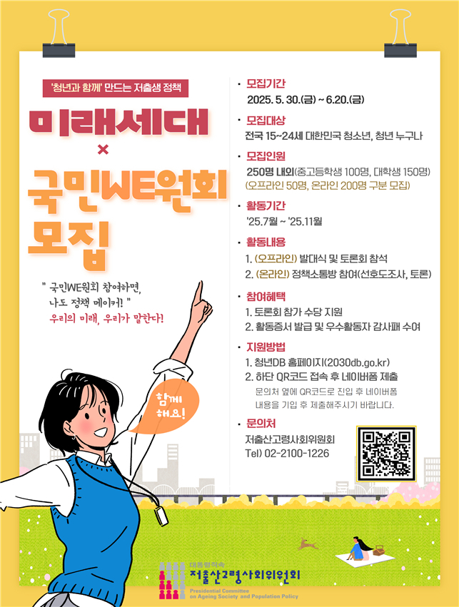 [sky 토토사이트=이태형 기자]저출산고령사회위원회는 5월 30일부터 6월 20일까지 ‘2025년 미래세대 국민WE원회(국민WE원회)’를 모집한다.