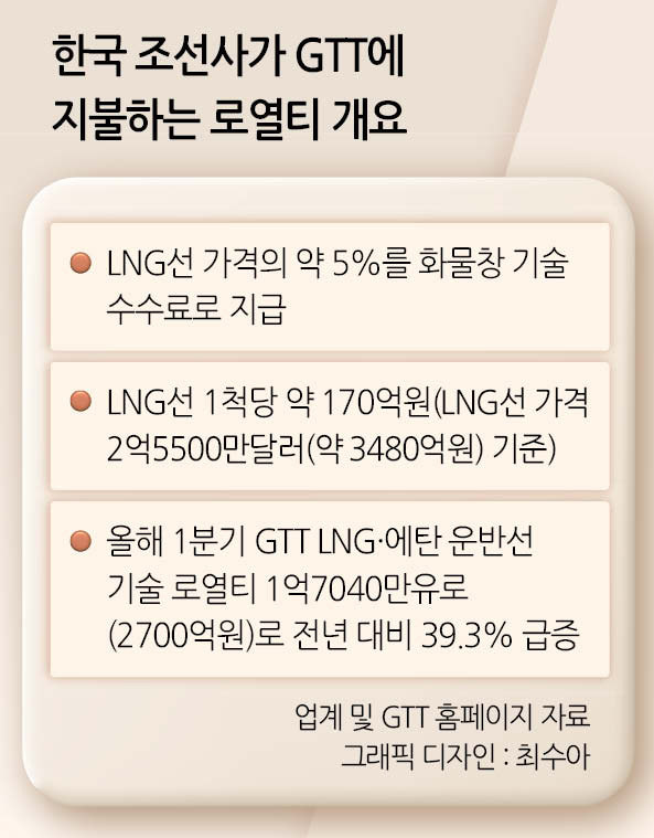 지난달 기준 세계 조선시장에서 새로 건조되는 토토사이트 w선 한 척의 가격은 2억5500만달러(약 3480억원)에 달한다. 토토사이트 w선을 건조할 때마다 GTT에 돌아가는 화물창 기술료는 약 5% 수준이다. 단순 계산 시, 국내 조선사들은 토토사이트 w선을 건조할 때마다 GTT에 170억원 이상의 로열티를 지불하는 것으로 추정된다.