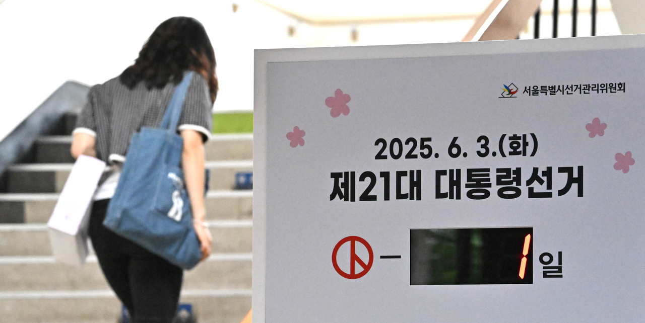 제21대 대통령 선거 본투표 일을 하루 앞둔 2일 오전 서울 종로구 서울시선거관리위원회 로비 알림판에 D-1일이 표시되어 있다. 제21대 대통령 선거 본투표는 오는 3일 오전 6시부터 오후 8시까지 전국 1만 4295개소 투표소에서 진행된다. 유권자들은 사전 투표와 달리 신분증을 지참해 지정된 투표소에서 투표를 해야한다. 임세준 기자
