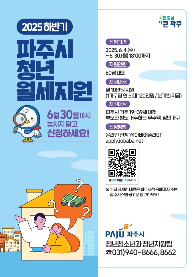 ‘청년 월세 불야성 토토사이트은 파주시가 청년들의 주거 안정과 경제적 자립을 돕기 위해 2022년부터 추진 중인 자체사업으로, 소득이 일정 기준 이하인 청년에게 월세(최대 10만원)를 최대 1년간 지원한다.
