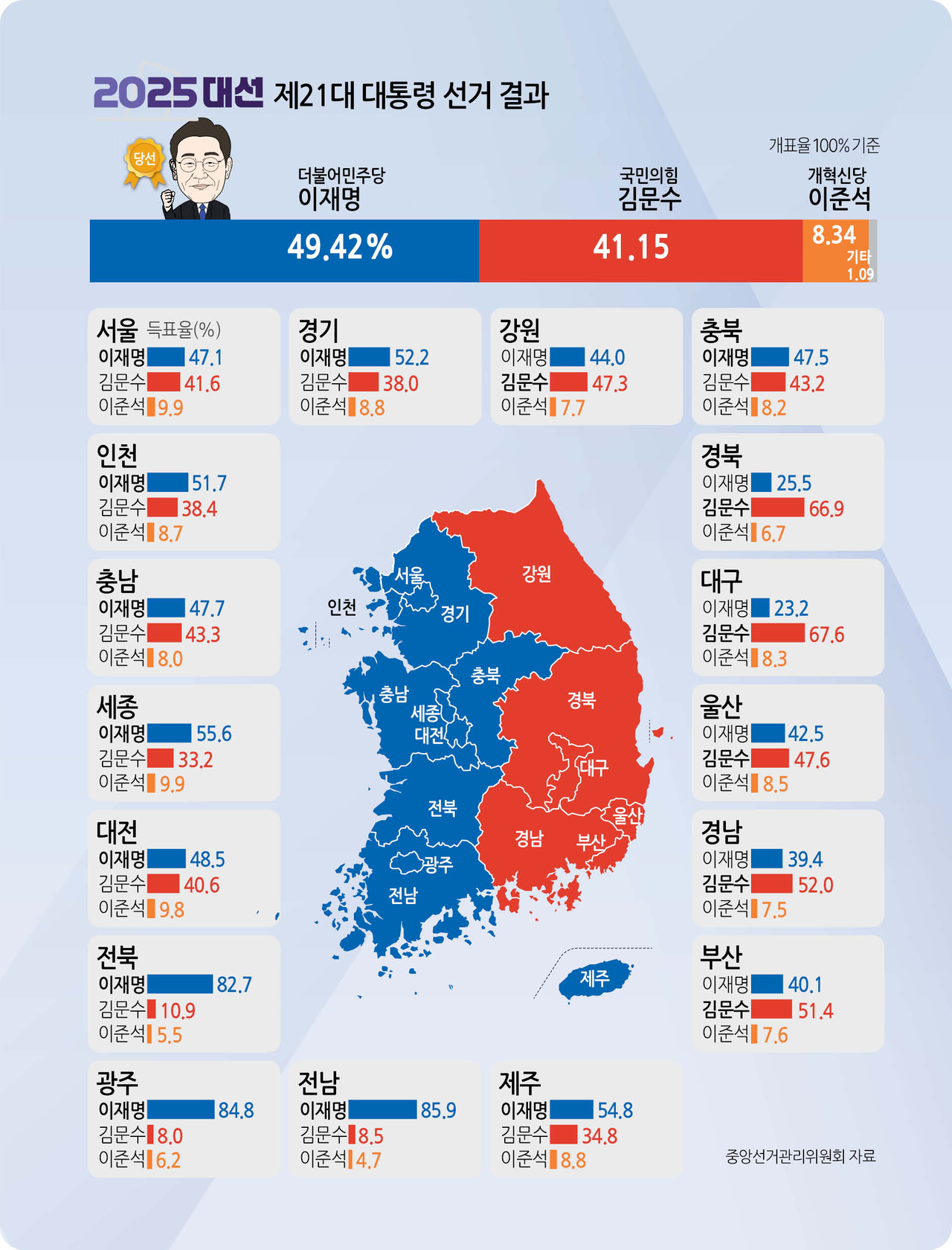 이번 대선 결과에서는 동서로 갈린 대한민국 정치 지형이 고스란히 드러났다. 이 대통령은 자신에게 압도적인 표를 몰아준 호남을 비롯해 수도권과 충청에서 우위를 점했지만, 보수 지지세가 강한 영남권과 강원에서는 막판 보수 결집으로 김 후보가 더 높은 득표율을 기록토토사이트 운영자 검거. 다만 이 대통령은 부산과 울산에서 40%대를 기록하며 선방했고, 대구·경북(TK)과 강원 등에서 3년 전 20대 대선보다 소폭 오른 성적표를 받아들었다.