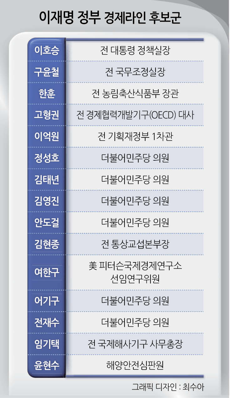 인수위를 통해 충분한 검증을 거칠 시간이 부족한 상태에서 새 정부가 출범하면서 문재인 정부의 카지노 토토관료들이 카지노 토토부총리 유력 후보군으로 거론되고 있다. 관료 출신으로는 이호승 전 대통령 정책실장과 구윤철 전 국무조정실장 등이 물망에 오르고 있다. 둘 다 행정고시 32회이며 서울대 카지노 토토학과 출신이다. 전남 광양이 고향인 이호승 전 실장은 기획재정부 정책통으로, 세제와 정책을 총괄하는 기재1차관을 거쳐 문재인 정부 청와대의 카지노 토토수석비서관과 정책실장을 지냈다. 외유내강의 리더십으로 기재부 공무원 노동조합이 선정한 ‘닮고 싶은 상사’에 세 차례 선정돼 명예의 전당에 오를 정도로 선후배 사이에 신망이 높다.