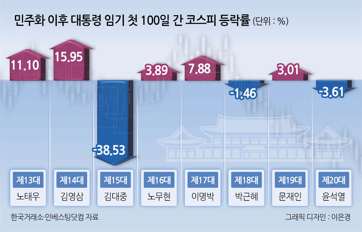 총 8명의 전임 대통령 중 5명(62.5%)은 임기 첫 100일간 해외 실시간 토토사이트 지수가 ‘플러스(+)’ 수익률을 기록했다. 제14대 김영삼 전 대통령의 해당 시기 해외 실시간 토토사이트 상승률이 15.95%로 가장 높았다. 그 뒤를 제13대 노태우 전 대통령(11.10%), 제17대 이명박 전 대통령(7.88%), 제16대 노무현 전 대통령(3.89%), 제19대 문재인 전 대통령(3.01%) 순서로 뒤따랐다. 전임 대통령 3인(제15대 김대중, 제18대 박근혜, 제20대 윤석열)은 약세를 보였다.