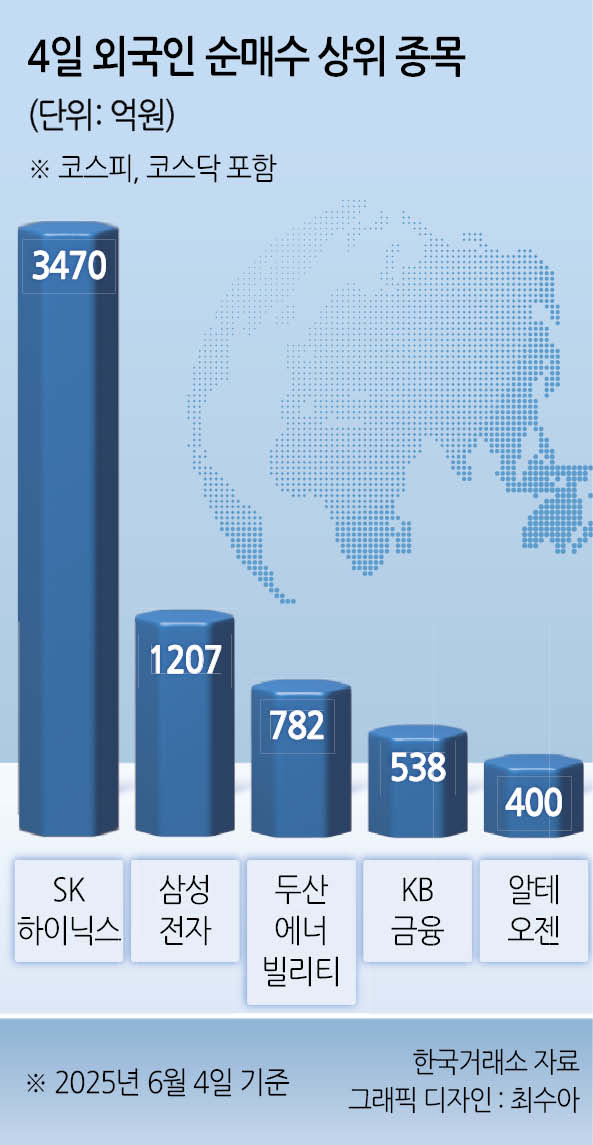 지난 4일 기준 외국인 투자자가 가장 많이 순매수한 종목은 1위 SK하이닉스(3470억), 2위는 삼성전자(1207억)로 국내 토토사이트 로그인 대장주로 쏠렸음을 알 수 있다. 이어 ▷두산에너빌리티(782억) ▷KB금융(538억) ▷알테오젠(400억) 순으로 외국인 순매수액이 많았다.