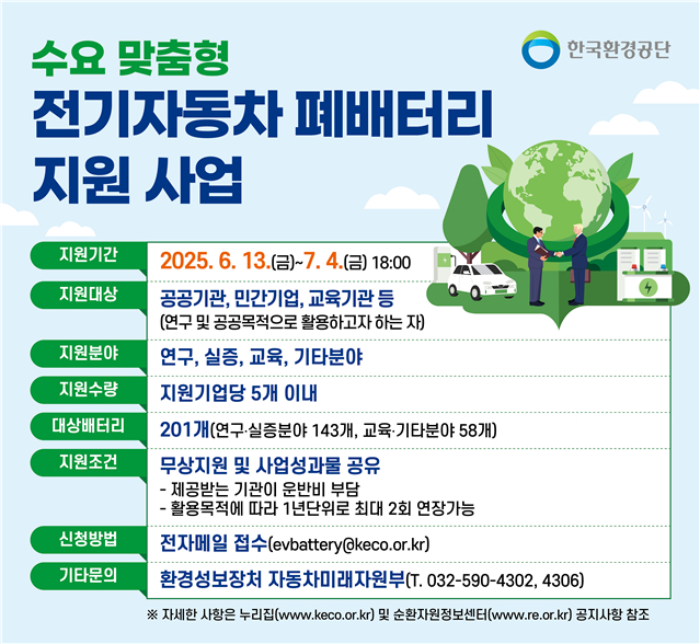 [헤럴드경제=이태형 기자]환경부 산하 한국환경공단은 13일부터 ‘2025년 수요 맞춤형 전기자동차 폐토토사이트 운영자 공소시효 지원사업’ 신청서를 접수한다고 밝혔다.