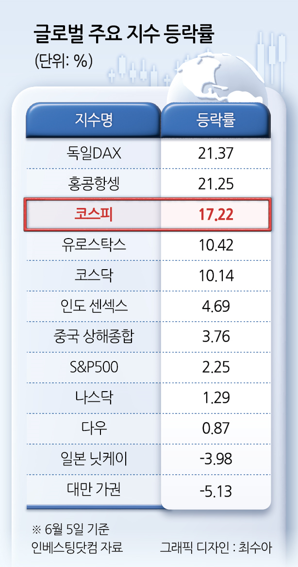 9일 인베스팅닷컴과 주요 증권사 집계에 따르면 올해 초부터 지난 5일까지의 토토 바카라 상승률을 기준으로 독일 DAX지수가 가장 높은 1위를 차지했다. 이어 홍콩 항셍지수가 2위, 한국 코스피가 3위에 올랐다. 코스피는 연초 대비 17%가량 상승하며 글로벌 12대 토토 바카라 중 세 번째로 높은 수익률을 기록했다.
