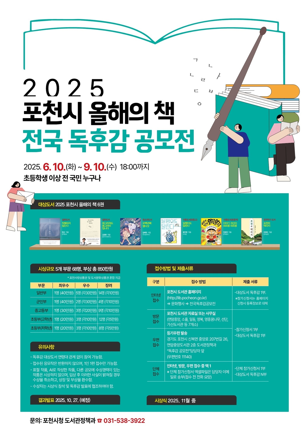 2018년부터 매년 개최해 올해로 8회를 맞는 이번 공모전은 일반부, 청소년부, 초등 저학년, 초등 고학년, 군인부의 총 5개 부문에서 68명을 선정, 총 850만원 상당의 시상이 이뤄지는 전국 최대 규모의 독후감 대회중 하나다.