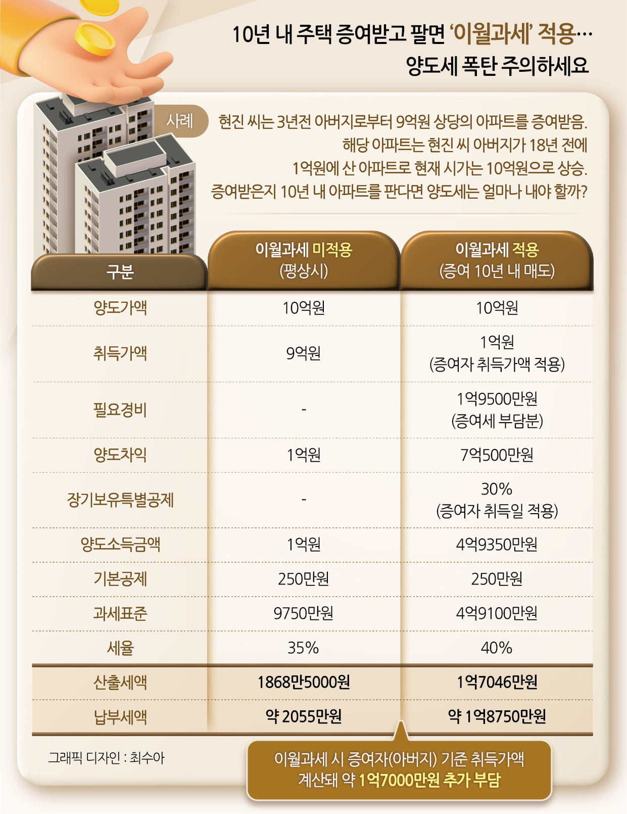 예를 들어, 현진 씨 아버지가 약 18년 전 1억원에 취득한 주택을 지금 시세인 10억원에 직접 양도했다면, 양도차익 9억원에 양도소득세를 전부 부담해야 하죠.