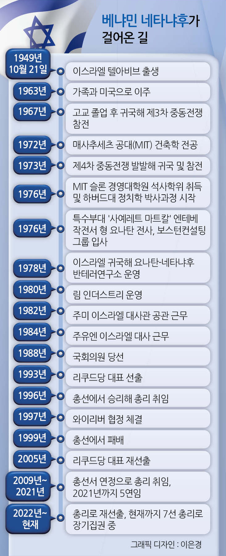 부친 벤지온 네타냐후를 따라 1963년 미국으로 건너간 그는 1967년 고교 졸업 후 이른바 제3차 중동전쟁이 터지자 형과 함께 귀국해 군에 입대했다. 1972년까지 6년여간 크고작은 작전에 투입돼 어깨에 총상을 입는 등 산전수전을 다 겪었다.