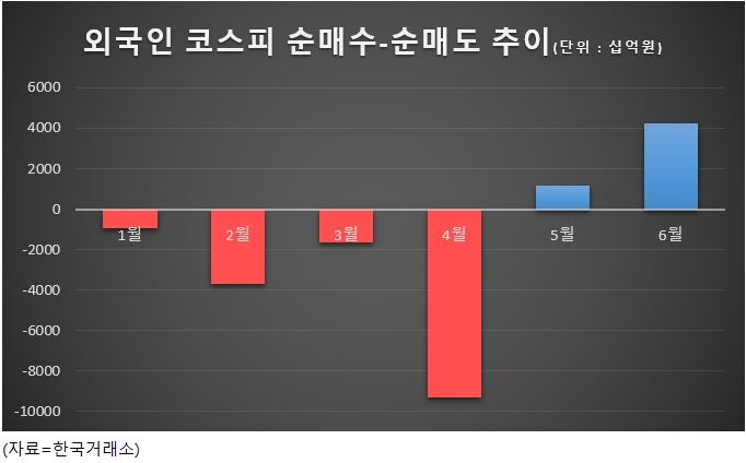 이 같은 국내 증시 상승의 가장 큰 동력은 외국인 순매수다. 지난해 8월부터 국내 증시를 계속해서 팔아온 외국인은 5월 1조1400억원 순매수로 돌아섰다. 이후 새 정부 출범 이후 매수 규모를 크게 불려 이달 들어 순매수 규모는 4조2560억원에 달한다.