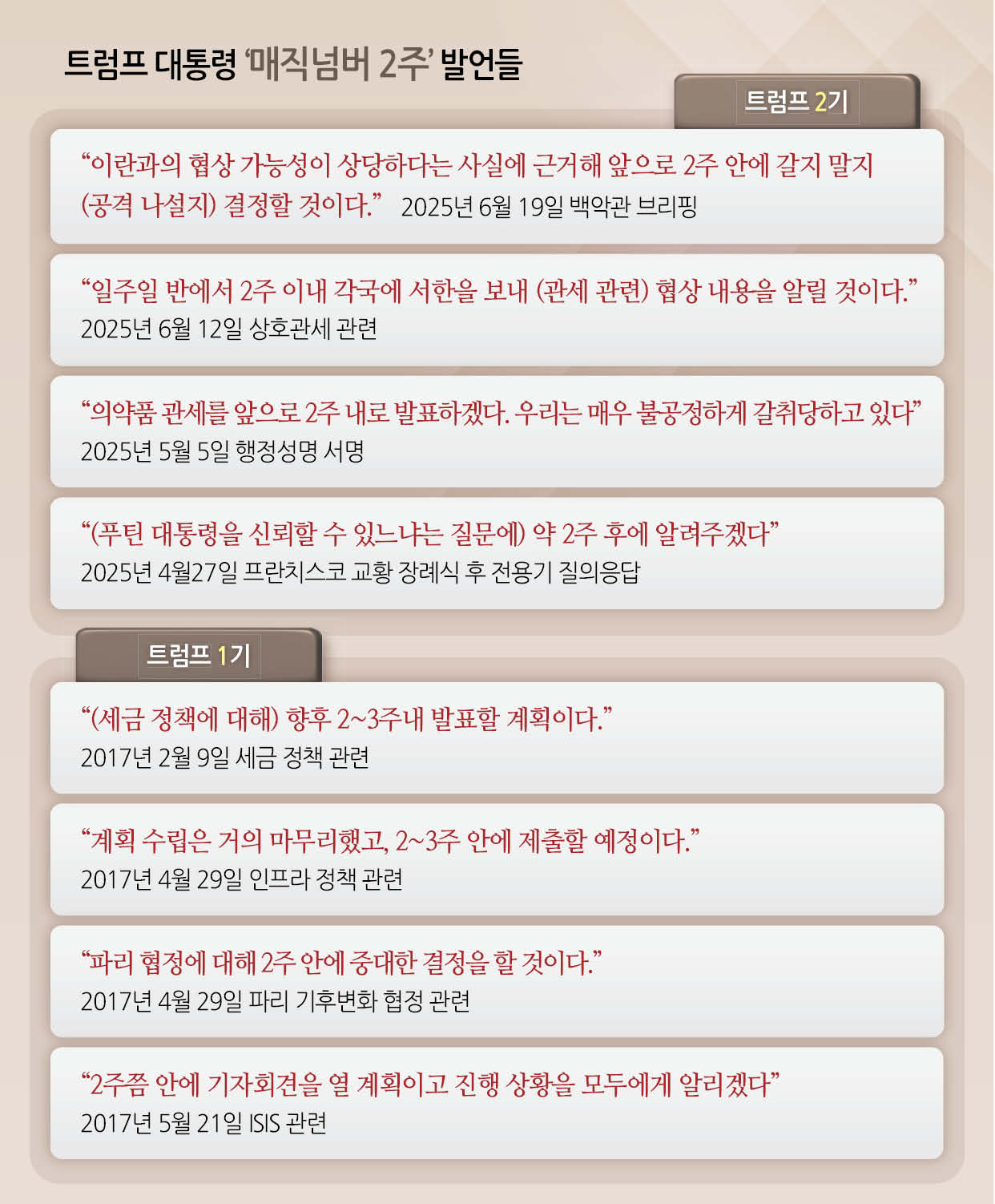 ▶트럼프에게 2주라는 마법의 숫자, 그 의미는?=한편 미국 언론은 트럼프 대통령이 지난달 우크라이나 전쟁 종전에 협력하지 않는 블라디미르 푸틴 러시아 대통령에게도 ‘2주 시한’을 제시했지만, 시한이 지나고서도 러시아에 아무런 대응 조치를 하지 않았다는 데 주목했다.