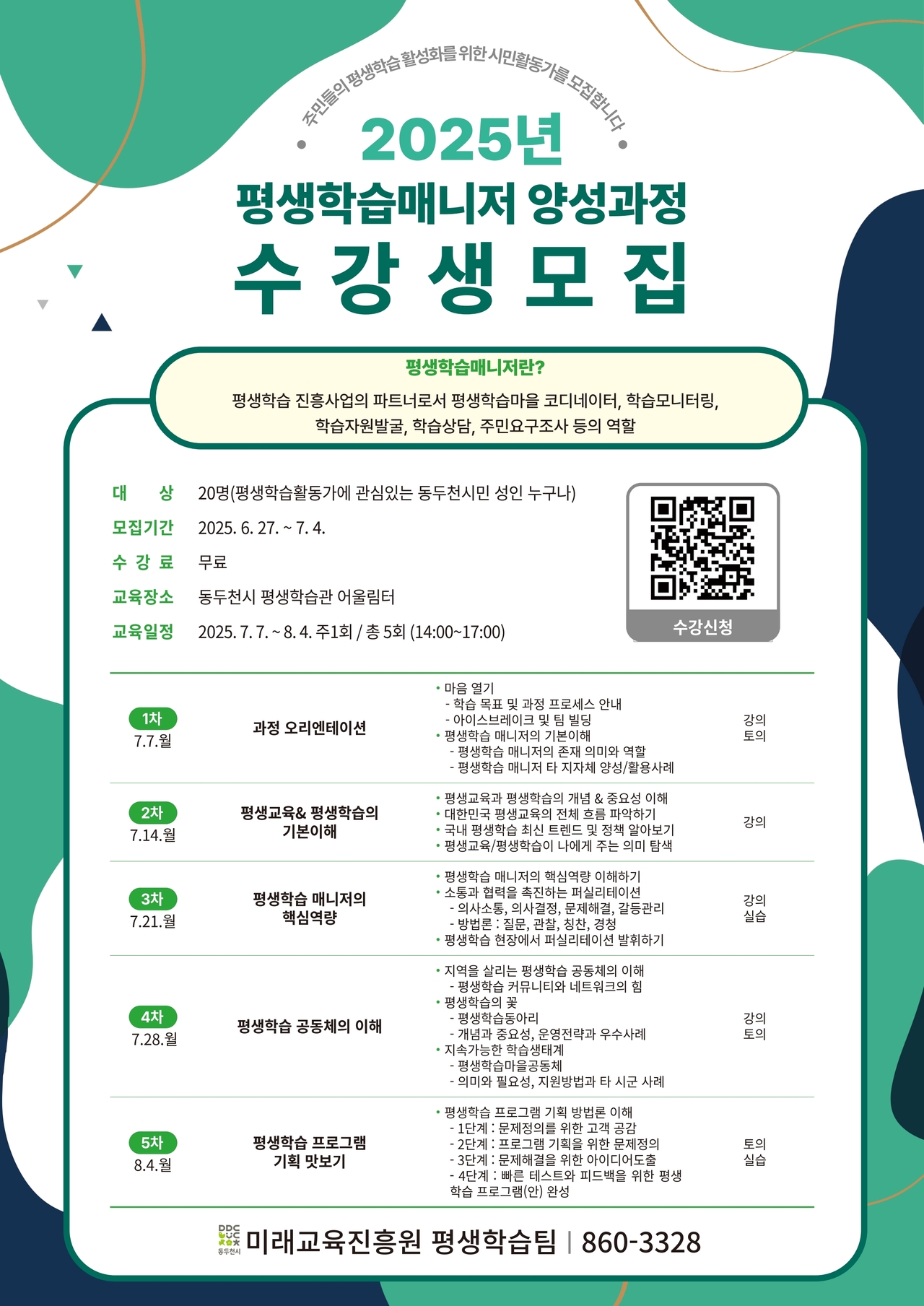[헤럴드경제=박준환 기자]동두천시(시장 박형덕)는 미래교육진흥원이 6월 27일부터 7월 4일까지 ‘2025년 토토사이트 포인트사기 매니저 양성과정’ 수강생을 모집한다고 24일 밝혔다.