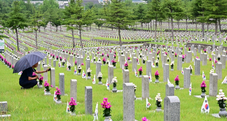 6·25 전쟁 75주년인 25일 오전 서울 동작구 국립서울현충원을 찾은 한 참배객이 비를 맞은 묘비를 닦으며 전사자의 넋을 위로하고 있다. 이상섭 기자 babtong@heraldcorp.com