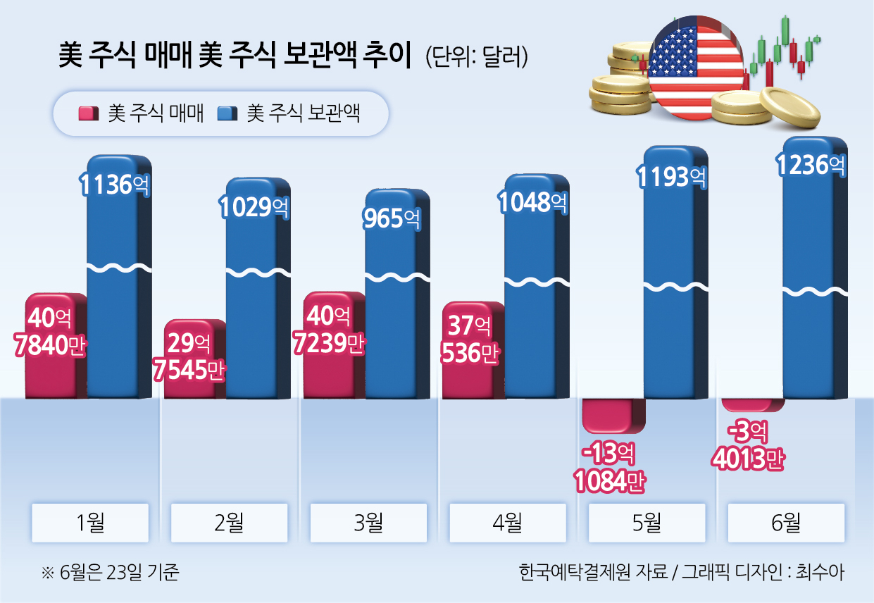 이달 들어 미국 주식 매수세는 부활 조짐을 보이고 있다. 지난달과 이달 순매수를 기록한 날은 같지만(6거래일) 평균 순매수액은 이달 1억2466만달러로 지난달(8185만달러) 대비 52% 늘었다. 매도세가 줄어든 가운데 미 증시가 반등하면서 보관액 규모는 1236억달러(168조원․23일 기준)로 올 들어 가장 높다.