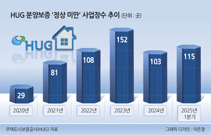 올해 1분기 기준 주택도시보증공사(HUG)가 토토사이트 마무리 멘트을 발급한 사업장 중 115곳이 부실 위험이 있는 것으로 나타났다.