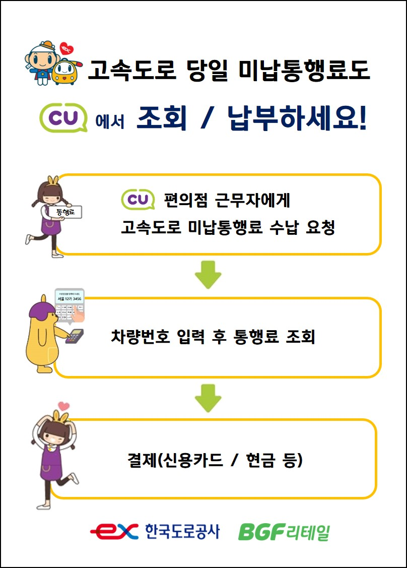 [헤럴드경제=신혜원 기자] 한국도로공사는 CU 편의점 운영사인 BGF리테일과 업무협약을 체결해 앞으로 전국 CU 편의점에서 고속도로 당일 미납 sky 토토사이트를 납부할 수 있다고 26일 밝혔다.