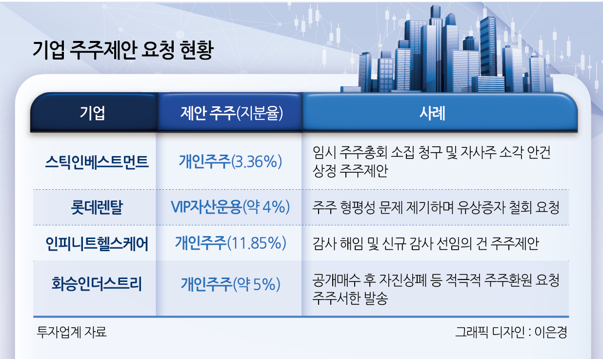 29일 금융투자업계에 따르면 롯데렌탈, 스틱인베스트먼트 등 복수의 상장사는 개인토토사이트 무료포인트 환전연합 및 일반토토사이트 무료포인트 환전 등으로부터 최근 배당·자사주 매입 확대 요구, 유상증자 등 주요 결정사항 재고 요청을 받았다.