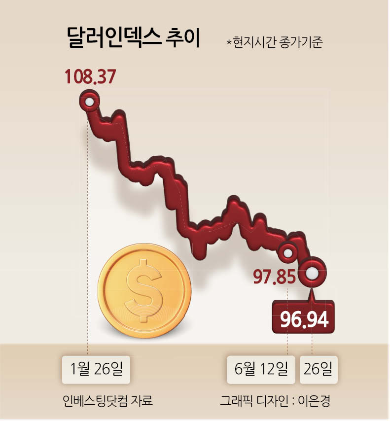 시장은 연준의 독립성 훼손을 우려하며 달러가치가 3년 3개월래 최저치로 떨어졌다. 주요 6개국 통화대비 달러 가치를 반영하는 달러인덱스는 26일(현지시간) 장 마감 기준으로 96.94을 기록했다. 이는 2022년 3월 초 이후 3년여 만에 최저치다.