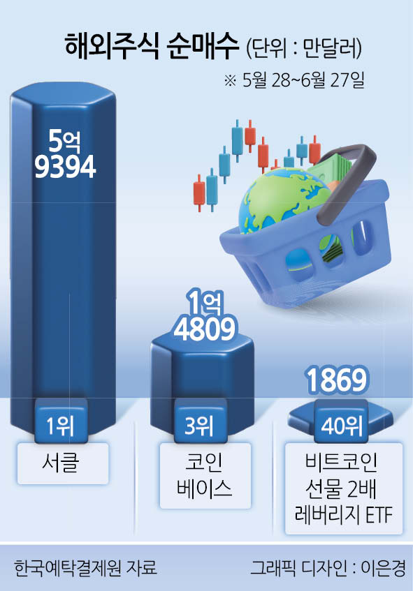30일 한국예탁결제원에 따르면 국내투자자의 한 달(5월28일~6월27일) 순매수 1위는 서클로 5억9394만달러(약 8101억원)에 달한다. 3위는 토토사이트 비즈베이스로 1억4809만달러(약 2020억원)로 집계됐다. 2위와 4위는 각각 테슬라 하루 수익률 2배를 추종하는 상품(DIREXION DAILY TSLA BULL 2X SHARES·3억232만달러), 애플(1억3103만달러)이 차지했다.