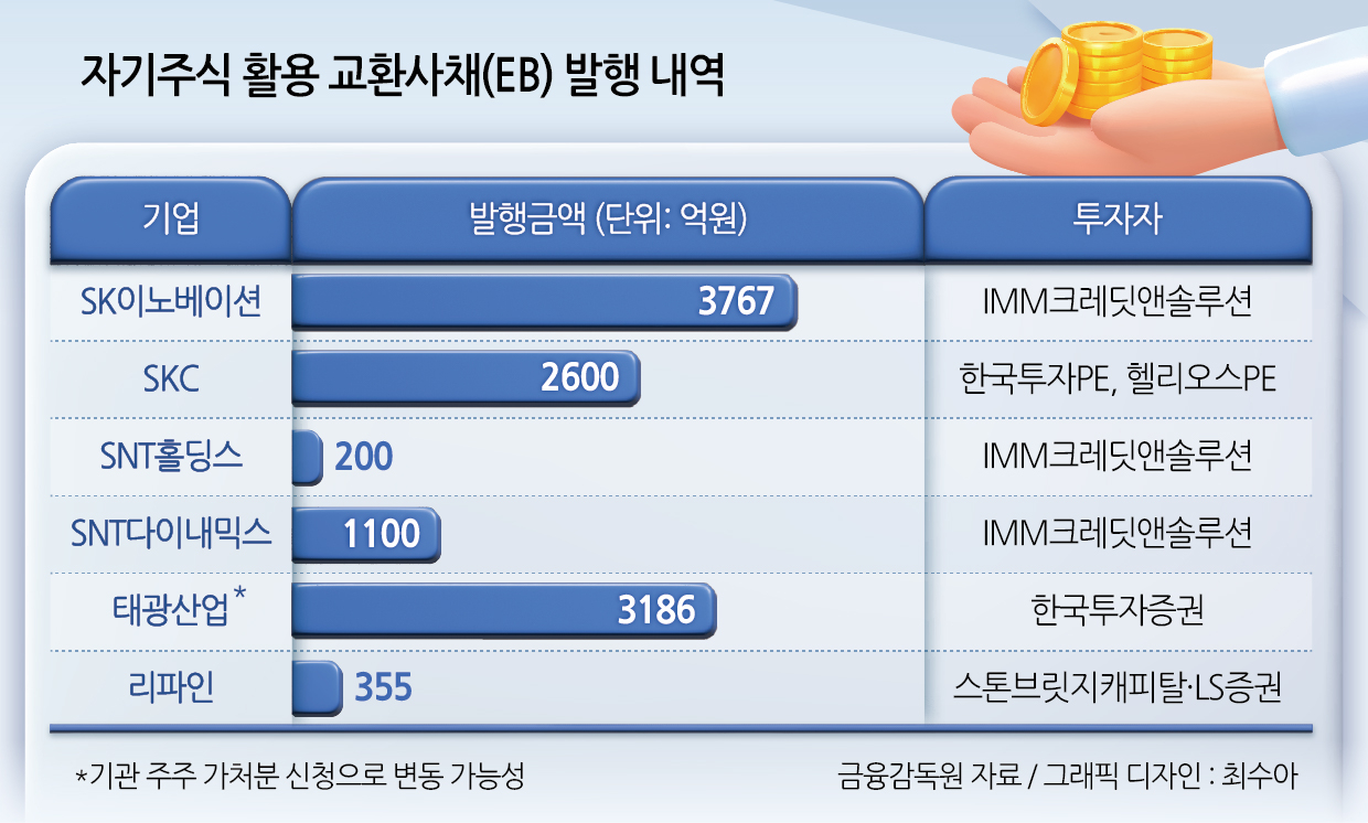 4일 투자은행(IB) 업계에 따르면 올해 토토사이트 쿠폰 기반으로 발행이 완료됐거나 예고된 EB 규모는 1조1208억원이다. 해당 기업은 ▷SK이노베이션 ▷SKC ▷SNT홀딩스 ▷SNT다이내믹스 ▷태광산업 ▷리파인 등이다. 태광산업의 경우 한국투자증권 도움을 받아 보유 토토사이트 쿠폰 전량을 EB로 처분할 계획을 세우고 있다. 다만 기관 주주인 트러스톤자산운용이 관련 절차에 제동을 걸었다. 주주에 미칠 영향을 고려해 반대하면서 법원에 가처분 신청한 상태다.
