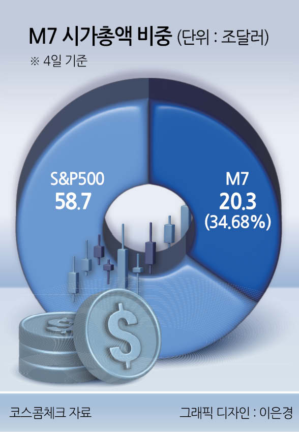 4일 코스콤체크에 따르면 S&P500가 이날 사상 최고치(6279.35)로 마감하면서 시총은 58조6666억달러로 집계됐다. 이 중 M7(엔비디아·애플·마이크로소프트·테슬라·메타·구글·아마존) 시총은 20조3484억달러로 S&P500의 34.68%를 차지했다. M7 시총 비중은 전날(34.64%)보다 0.04%포인트 올랐다.