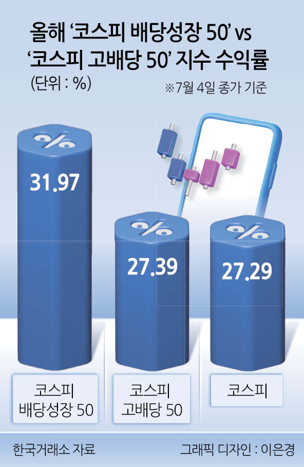 실제로 올해 들어 고배당주와 비교했을 때 마스터 토토사이트의 수익률이 웃도는 상황이다. 한국거래소에 따르면 지난 4일 종가 기준 ‘코스피 배당성장 50’ 지수의 수익률은 31.97%로 ‘코스피 고배당 50’ 지수의 수익률 27.39%보다 4.58%포인트 더 높았다.