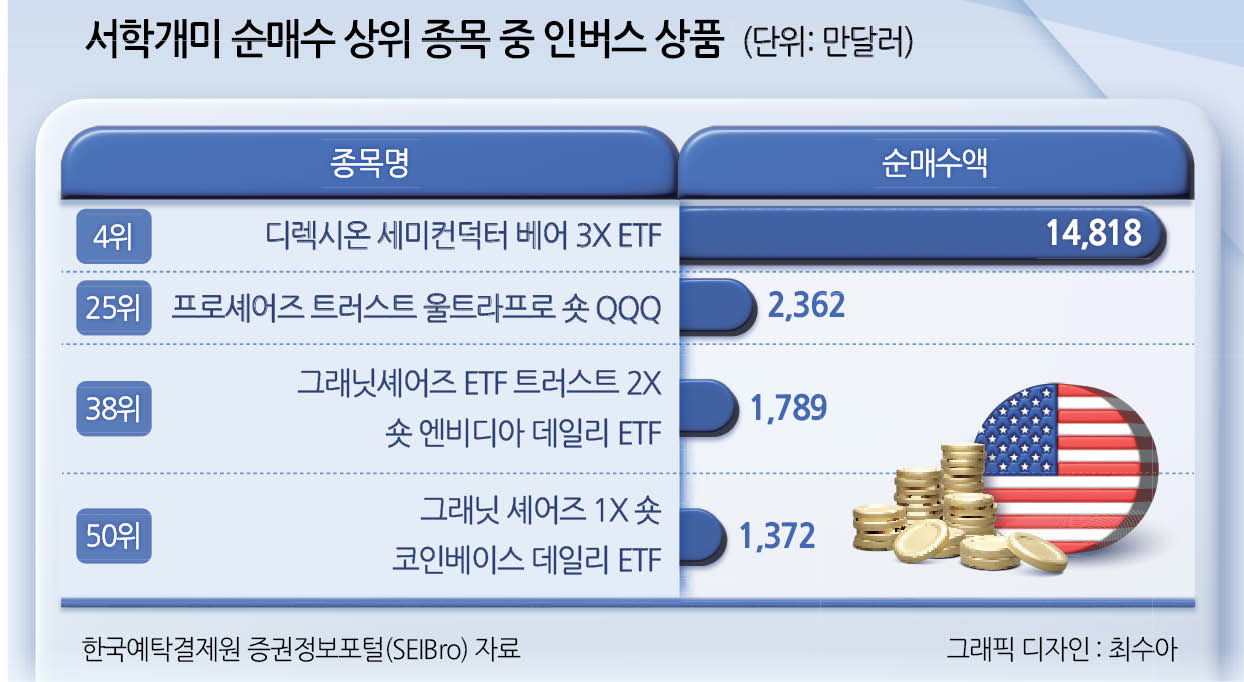 8일 한국예탁결제원 증권정보포털에 따르면 지난달 국내 투자자들이 미국 주식시장에서 가장 많이 순매수한 종목 상위 50개 중 4개가 sa 토토사이트 상품으로 나타났다. 이 상품 대다수는 기술주 하락에 1~3배로 레버리지 투자하는 고위험 구조다.