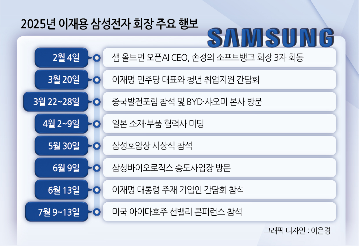 이 회장은 지난 2월 2심에서 무죄가 선고된 바로 다음날 삼성 서초사옥에서 샘 올트먼 오픈AI CEO, 손정의 소프트뱅크 회장과 3자 회동을 갖기도 했다.