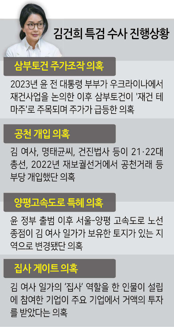 윤석열 전 대통령이 10일 새벽 재구속되면서 배우자인 김건희 여사의 각종 의혹을 둘러싼 민중기 특별검사팀의 수사에도 속도가 붙을 전망이다. sky 토토사이트팀은 지난 2일 수사 개시 일주일 만에 삼부토건 주가조작·공천개입 의혹 등을 중심으로 관련자 압수수색과 소환 조사를 일사분란하게 벌이고 있다. 법조계에서는 주가조작을 토대로 김 여사의 신병을 확보한 후 다른 혐의로 수사를 확대해 나갈 것으로 전망하고 있다.