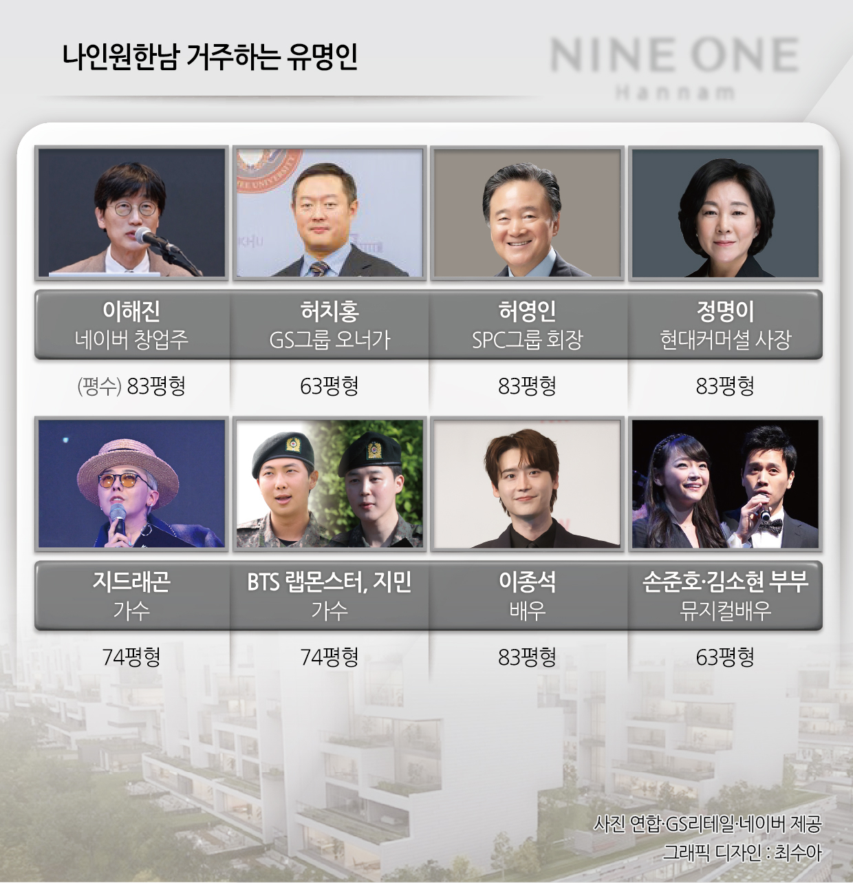 실제 GS그룹 오너 4세인 허치홍 GS리테일 MD본부장과 사촌 허준홍 삼양통상 사장이 각각 206.9㎡(이하 전용면적), 244.3㎡ 평형을 분양받아 거주 중이다. 정몽구 현대차그룹 명예회장의 둘째 딸 정명이 현대커머셜 사장과 허영인 SPC그룹 회장은 273.9㎡에 달하는 복층 아파트를 사들였다. 이 외에도 김승호 보령제약 회장의 딸 김은정 보령메디앙스 회장과 최성원 광동제약 회장, 김택헌 전 엔씨소프트 수석부회장 등이 분양받아 거주 중이다.