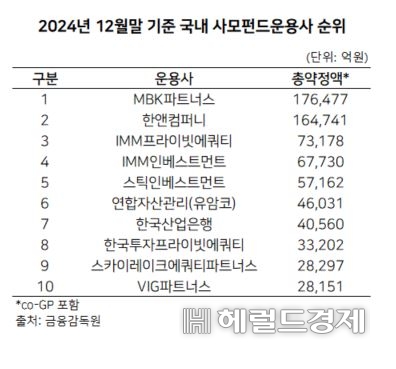 금감원이 이달 초 발표한 ‘기관전용 사모집합레고토토기구 현황’에 따르면 2024년 12월말 기준 10조 이상을 운용하는 GP는 MBK파트너스, 한앤컴퍼니 등 두 곳에 불과했으며 5조원 이상을 운용하는 곳은 IMM PE, IMM인베스트먼트를 비롯해 스틱인베스트먼트 등 5개사다.