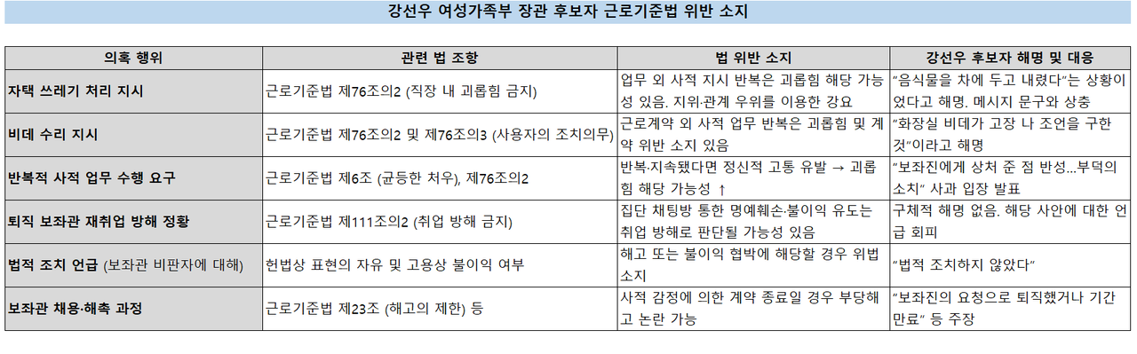 [헤럴드경제=김용훈 기자] 강선우 여성가족부 장관 후보자가 과거 자신의 보좌진에게 반복적으로 사적인 업무를 지시한 정황이 드러나면서 직장 내 괴롭힘 및 레드벨벳 토토 위반 논란에 휩싸였다.