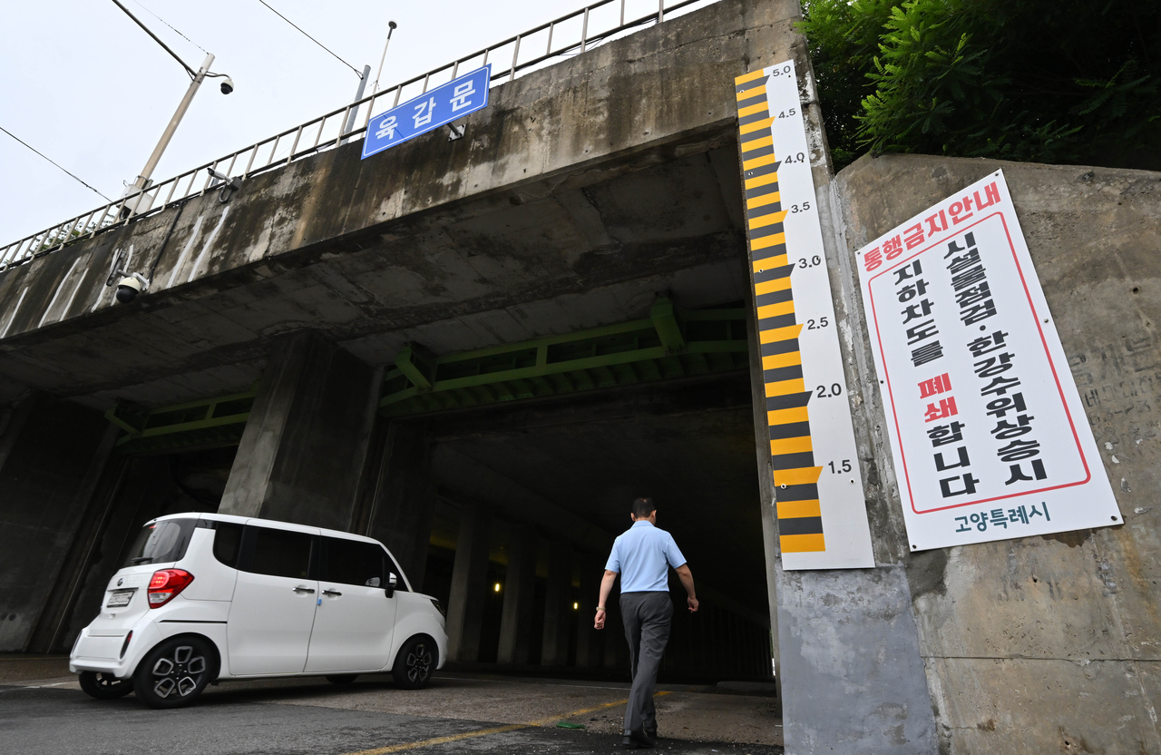 오송 지하차도 참사 2주기인 15일 오전 경기도 고양시 덕양구의 한강 육갑문 입구에 한강수위상승시 지하차도 폐쇄 안내문이 부착되어 있다. 오송 지하차도 참사는 지난 2023년 7월15일 오전 청주시 흥덕구 오송읍 궁평2지하차도가 인근 미호강 범람으로 침수되면서 14명이 숨지고 16명이 다친 사건이다. 이재명 대통령은 참사 2주기를 하루 앞둔 14일 현장을 방문해 직접 둘러본 뒤 안전 개선 상황을 점검하며 관리부실 인명사고에 대해 엄벌하겠다고 밝혔다.
