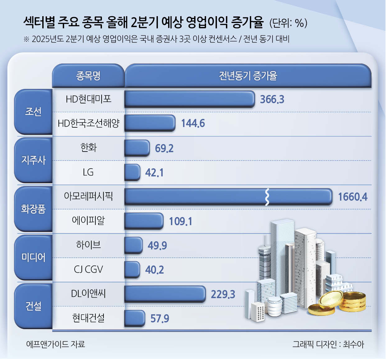 삼성전자·LG전자·LG에너지솔루션 등 주요 기업들의 잠정토토사이트 들어가는법 발표를 시작으로 2025년도 2분기 토토사이트 들어가는법 시즌이 막을 올렸다. 증권가에선 1년 전 대비 올해 2분기 토토사이트 들어가는법 개선세가 뚜렷할 것으로 보이는 섹터로 ‘미디어·지주사·화장품·조선·건설’을 제시했다.