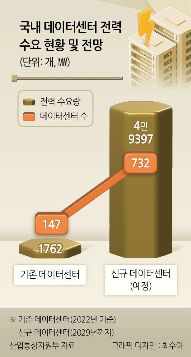 산업통상자원부에 따르면 국내 데이터토토사이트 추천 1곳의 연간 평균 전력 사용량은 25GWh(기가와트시)로, 4인 가구 약 6000가구가 1년 동안 사용하는 전력량과 비슷하다. 2022년 12월 기준 국내 147개 데이터토토사이트 추천의 전력 수요(최대 순간 사용 전력)는 1762메가와트(㎿)이며, 2029년까지 신설 예정인 732개 신규 데이터토토사이트 추천의 전력 수요는 총 4만9397㎿에 이를 것으로 전망된다.