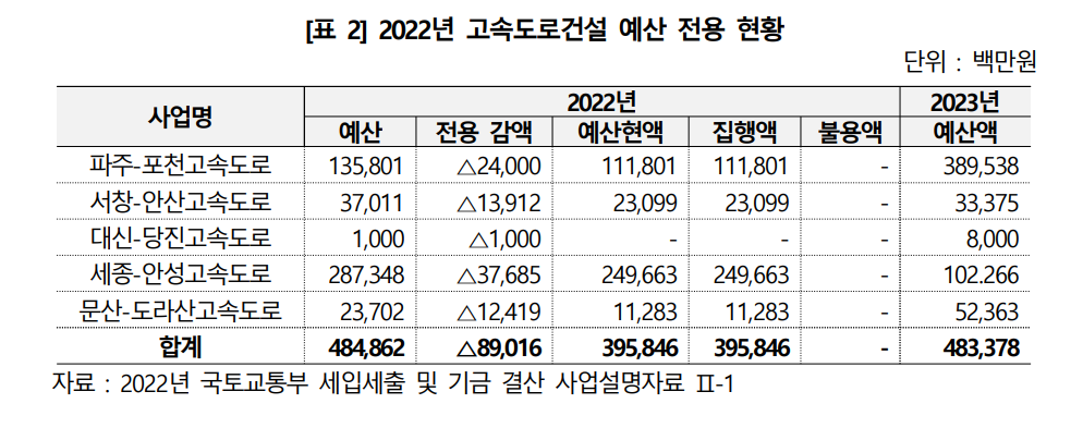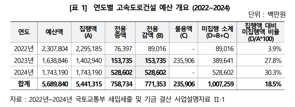 17일 나라살림연구소에 따르면 국토교통부의 2022~2024년 고속도로 건설 멤버십토토 가운데 전용 또는 불용된 금액은 총 1조727억원에 달했다. 이는 3년간 실제 집행된 5조4413억원 대비 약 18.5% 수준이다.