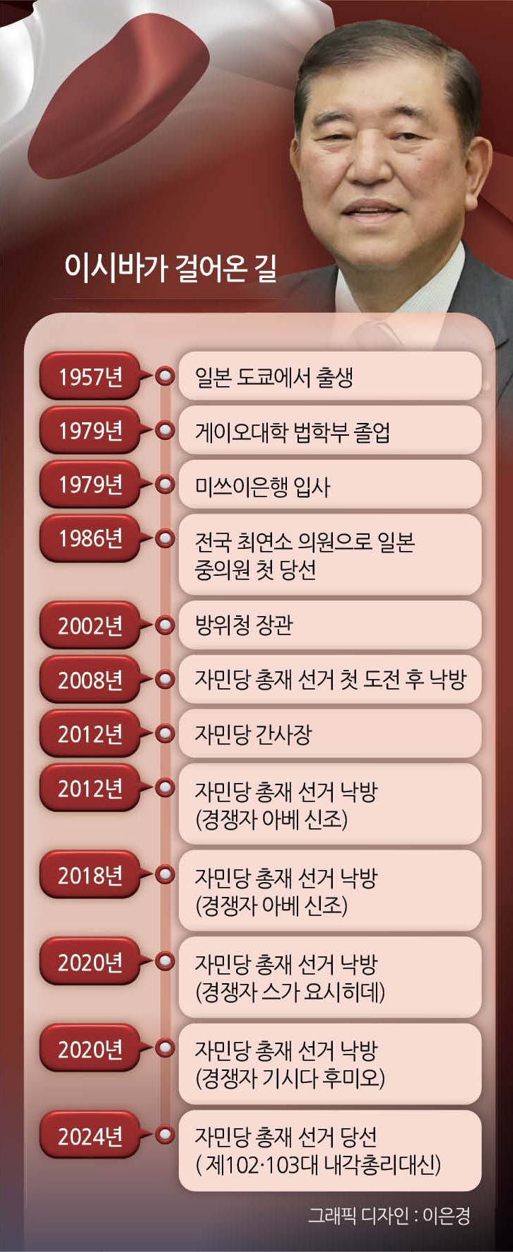 총재 선거에서 그는 뽑힐 것 같으면서도 뽑히지 않은 인물이었다. 2012년에는 1차 투표에서 1위를 차지하기도 했지만 주요 파벌 수장의 ‘오더’가 좌우하는 결선 투표에서 아베에게 밀렸다.