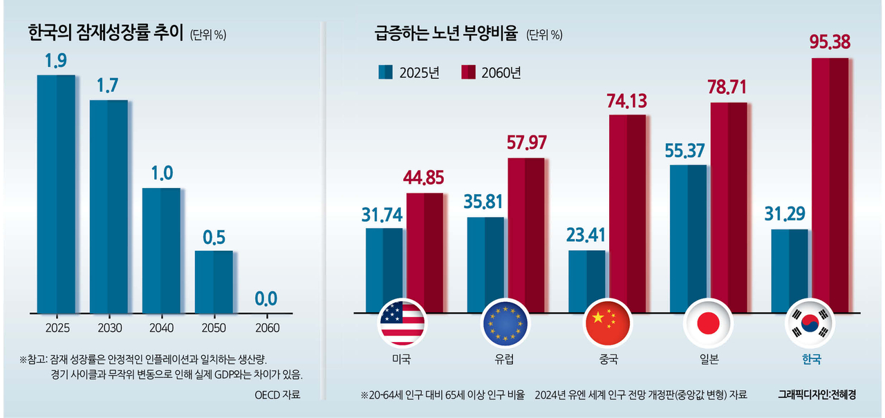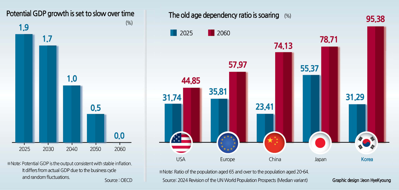 인구 고령화는 토토사이트 통장 묶는법의 성장을 근본적으로 위협한다. 2025년 31%였던 노년부양비(65세 이상/20~64세)는 2060년 95%까지 급등할 것으로 예상된다. 이는 2060년에는 생산가능인구 1명당 노인 1명이 존재한다는 의미다. 최근 출산율이 반등하고 있고, 이민 확대도 인구 구조 개선에 기여할 수 있지만, 보다 중요한 것은 생산성 제고 및 고용 확대를 통해 경제를 적응시키는 것이다.