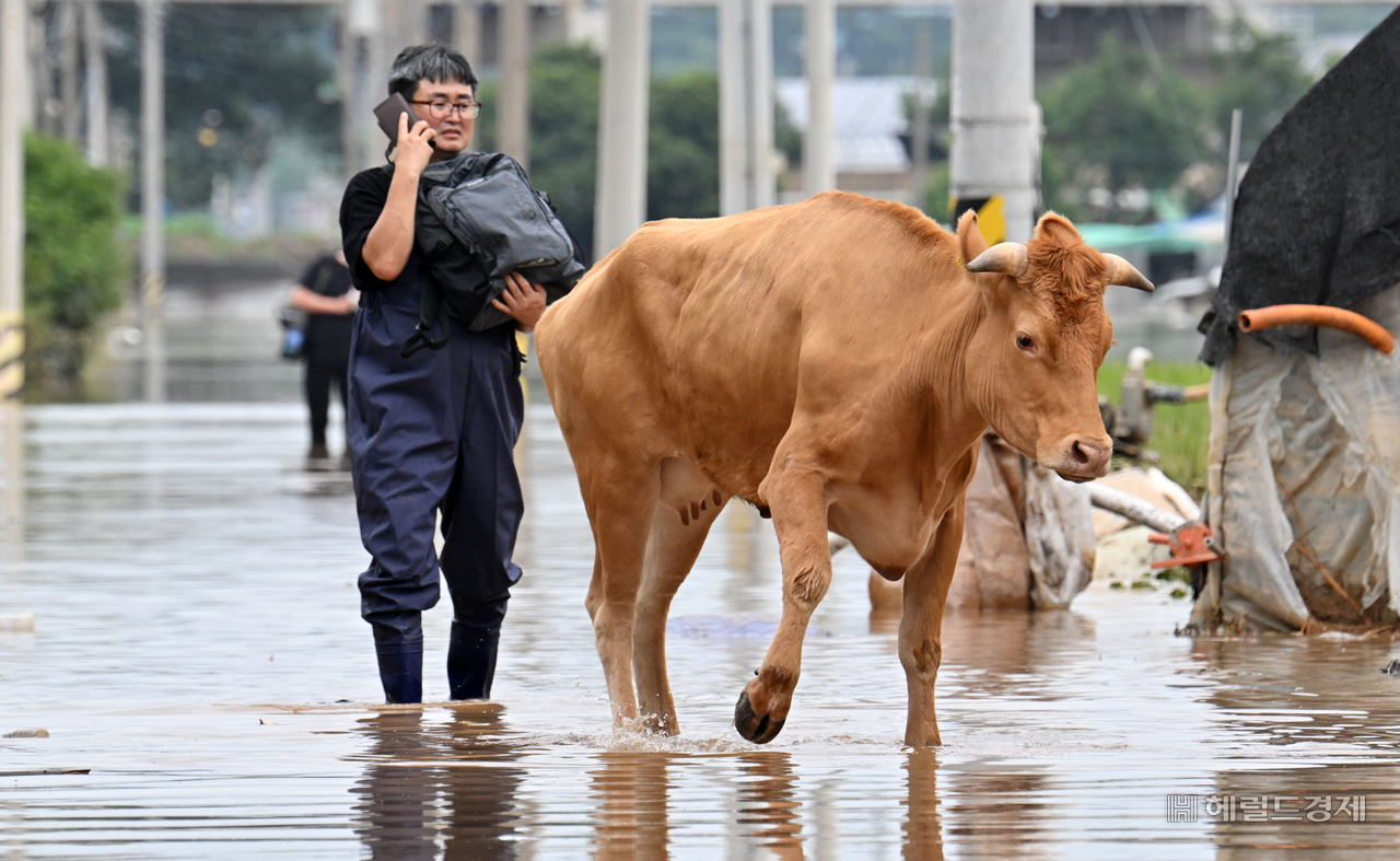 [페가수스 토토경제(예산)=임세준 기자] 충청권에 400㎜ 넘는 호우가 내려 피해가 속출한 가운데 18일 오전 충청남도 예산군 고덕면 용리에서 소들이 마을을 배회하고 있다. 지난 17일 충남 예산의 삽교천이 범람하며 하천 일대 많은 마을이 침수피해를 입었다. 기상청에 따르면 이번 비는 18일 오전 10시 기준 소강상태를 보이고 있으나, 서해상에서 비구름대가 지속해서 유입되고 있어 오는 19일까지 강우량 30∼80㎜의 집중호우가 내리는 곳도 있겠다.