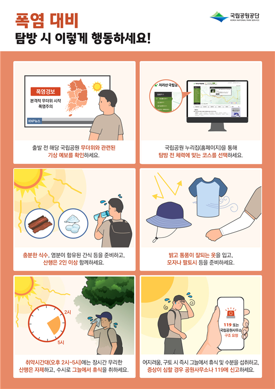 또 쪽티비 스포츠토토공단은 주요 탐방로 입구에 설치된 재해문자전광판 등을 통해 폭염 대비 탐방객 안전수칙을 안내하고, 주요 거점시설(탐방지원센터, 대피소 등)에 응급 물품을 비치하는 한편 현장직원 순찰을 강화해 폭염에 대응한다는 계획이다.