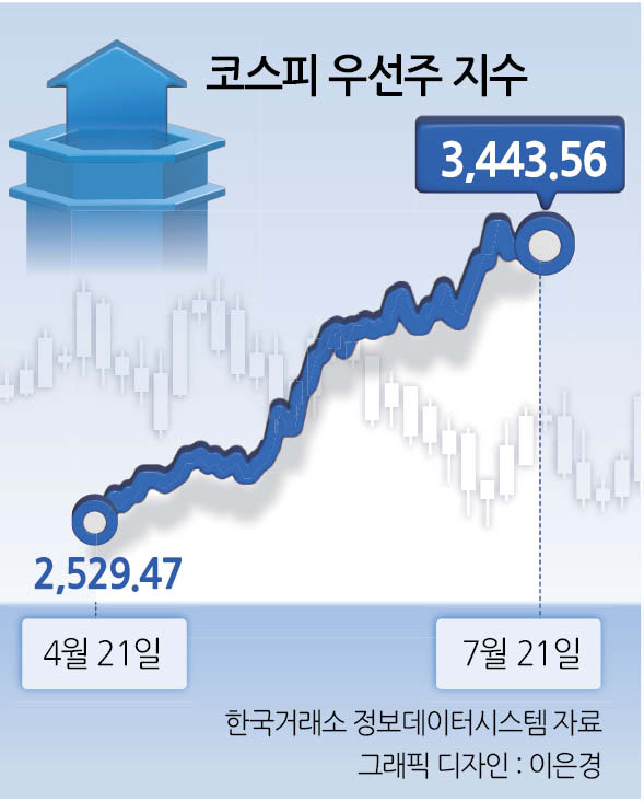 22일 한국거래소 정보데이터시스템에 따르면 삼성전자·현대차·미래에셋증권·두산 등 주요 토토사이트 들어가는법로 구성된 코스피 토토사이트 들어가는법 지수는 지난 3개월간 2529.47에서 3443.56으로 25.83% 상승했다. 코스피 상승률(29.92%)보다는 낮지만 증권가에서는 향후 상승 여력이 있다는 전망이 나온다.