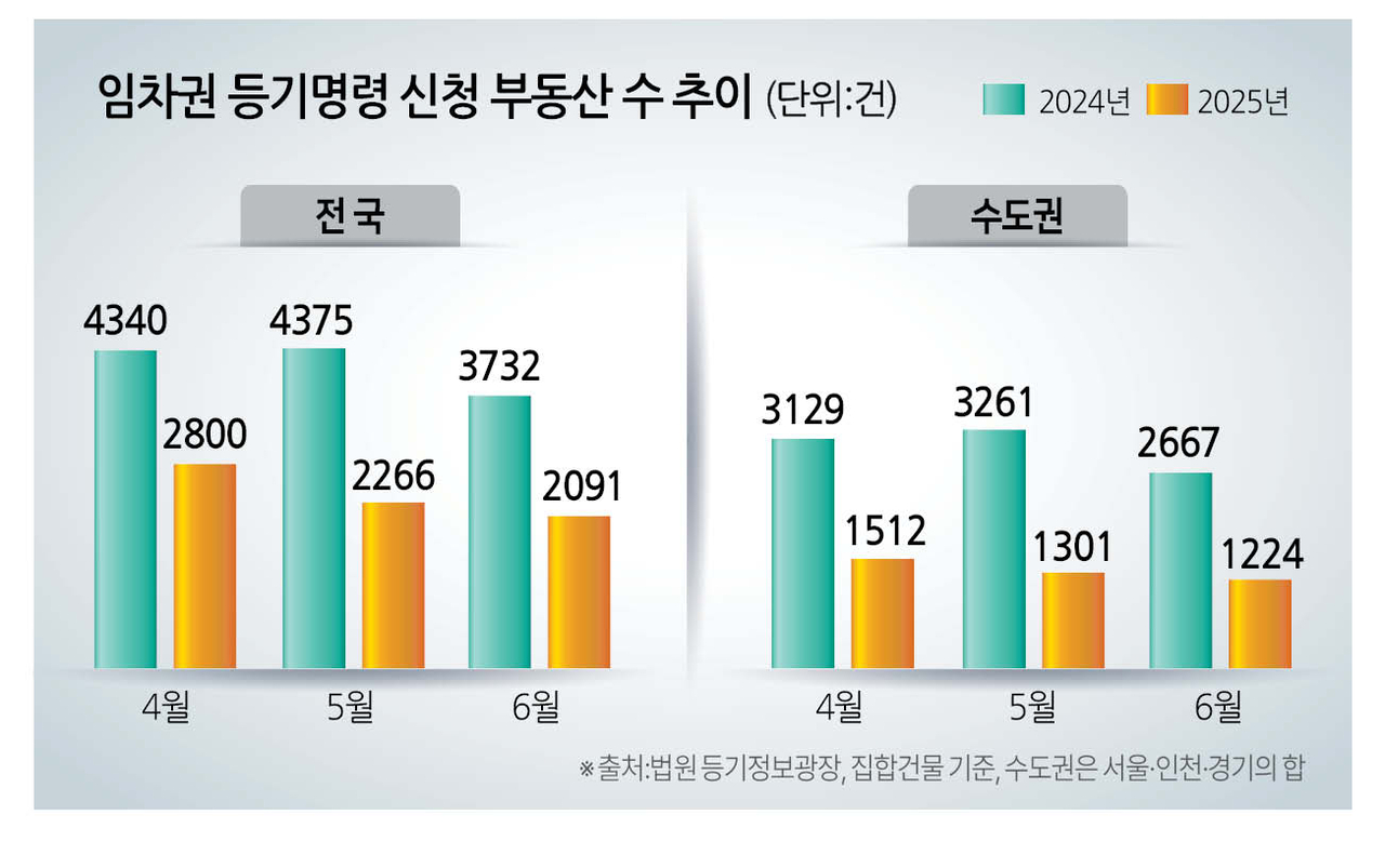 22일 법원 등기정보광장에 따르면 올해 1~6월 임차권토토사이트 fa 신청 부동산 수(전국, 집합건물 기준)은1만5255건으로 전년 동기(2만6027건) 대비 41.1% 감소했다. 특히 수도권의 해당 건수는 8858건으로 같은 기간 53.7% 감소해 전체 평균 대비 더 큰 폭으로 줄어들었다.