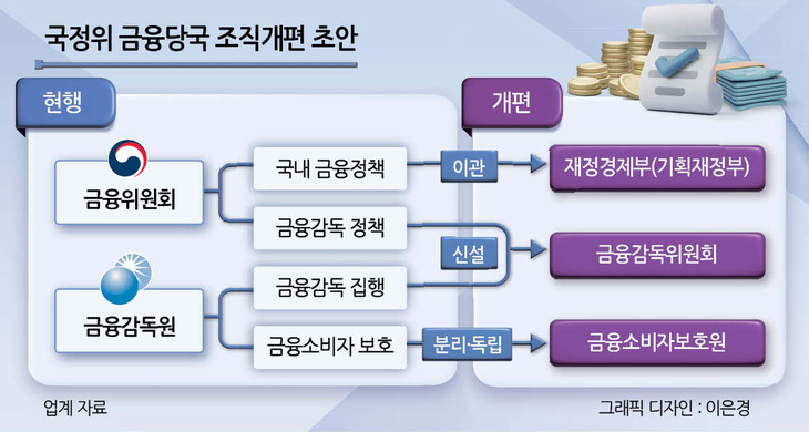 23일 금융권에 따르면 국정기획위원회가 도출한 금융당국 조직개편 초안은 토토사이트 마초의 금융정책 기능을 기재부로 옮기고 감독 업무를 총괄하는 금감위를 신설하는 것을 골자로 한다. 이와 함께 금감원 금융소비자보호처를 금소원으로 분리 독립하도록 했다.