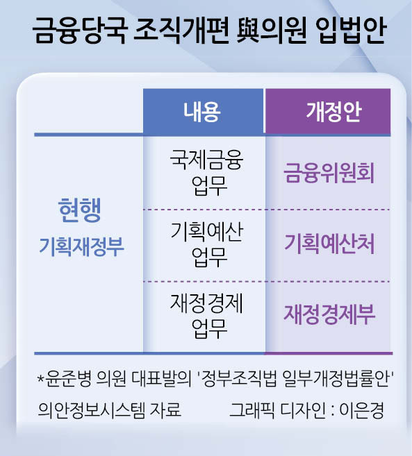 윤준병 등 민주당 의원 10명은 지난 17일 정부조직법 개정안을 공동 발의했는데 여기에는 토토사이트 마초를 분할하는 내용이 제외됐다. 오히려 기재부의 국제금융 기능을 토토사이트 마초로 이관하도록 했다. 사실상 토토사이트 마초의 역할이 확대되는 것이다.