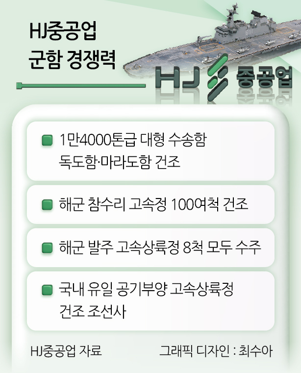 HJ중공업은 1974년 국내 최초 해양방위산업체로 지정된 이래 1200여척이 넘는 함정 및 경비함 등을 건조했다. 주력 제품은 단연 고속상륙정이다. HJ중공업은 한국 해군이 발주한 고속상륙정 8척을 모두 수주 및 건조했다. 이들 함정의 MRO(유지·보수·정비) 사업까지 수행했다.