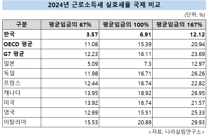 24일 나라살림연구소 김용원 책임연구원이 발표한 ‘근로소득세 실효토토사이트 행오버 국제 비교’ 보고서에 따르면, 2024년 기준 한국의 근로소득세 실효토토사이트 행오버은 평균임금의 67% 구간에서 3.57%로 나타났다. 이는 OECD 평균(11.08%)과 G7 평균(12.23%)의 절반에도 미치지 못하는 수준이다.