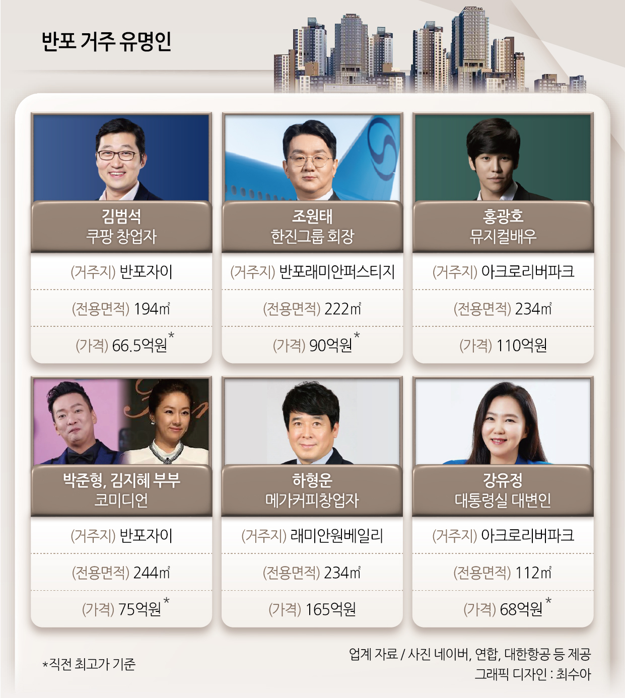 올해 2월에는 하형운 메가커피 창업자가 래미안 원베일리 234㎡(165억원) 펜트하우스를 매수해 화제가 됐고, 옆 단지인 아크로리버파크(아리팍)의 234㎡은 뮤지컬배우 홍광호가 2023년 10월 110억원에 매입해 거주 중이다.